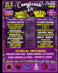 Luego del éxito de estas dos iniciativas, el trabajo de Dirección de Deportes de la Municipalidad no se detiene y para el sábado 30 y domingo 31 de julio se programó evento de freestyle y breaking en la Población Antumapu, avanzando en la propuesta de llegar con esta clase de iniciativa a distintos puntos, y ninguno mejor para esta clase de competencia que este espacio, donde las familias podrán ver en acción a los mejores mcs de la región y agrupaciones de baile de alto nivel técnico, todo absolutamente gratuito desde las 12 horas, resaltando que será un ambiente libre de drogas y alcohol, incentivando el encuentro en torno a la cultura y deporte urbano.