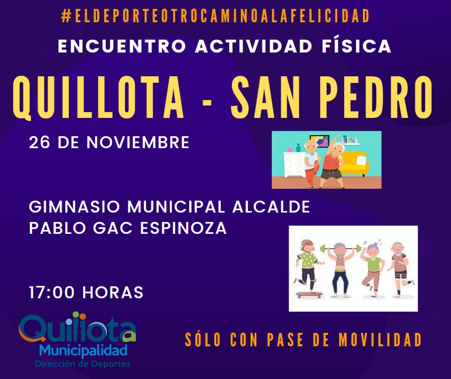 Entre los ejes que potenciará el Alcalde de Quillota Óscar Calderón durante su gestión se encuentra seguir con el trabajo que le permita a las personas de la tercera edad tener una buena calidad de vida, aspecto en donde la actividad física pasa a jugar un rol muy importante, ya que a través de distintos talleres en esta área se hace posible que puedan mantenerse activos e independientes, además de los beneficios en salid que ello significa, por lo que a través de la Dirección de Deportes, el municipio durante todo el año ejecuta estos programas de forma gratuita, y el viernes se vivirá un gran encuentro en el Gimnasio Municipal Alcalde Pablo Gac Espinoza.