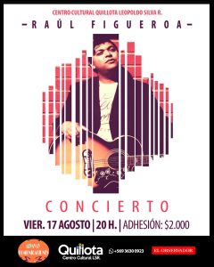 Raúl Figueroa presentará su nuevo disco a las 20:00 horas, concierto que promete ser variado y extenso, y tiene un valor de entrada de $2.000.- pesos, los que son íntegros para este reconocido y muy talentoso artista popular.