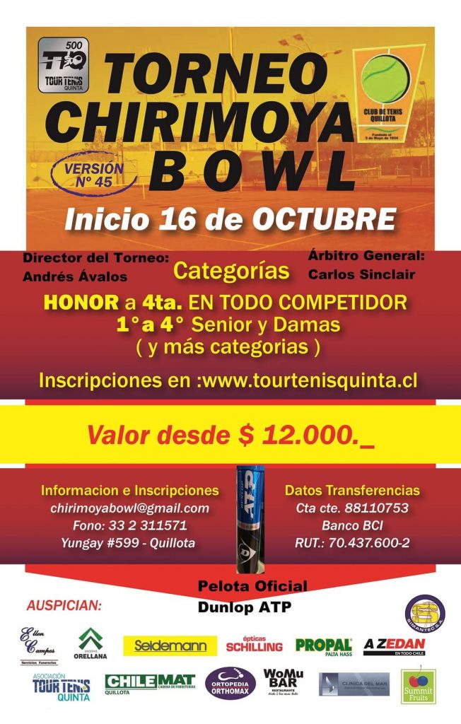 A medida que las ciudades fueron avanzando en Plan Paso a Paso de Gobierno a través del Ministerio de Salud, de manera paulatina se han ido retomando las actividades deportivas, tanto públicas como privadas, tal como ha sucedido en Quillota, que desde el próximo sábado 16 de octubre vivirá una nueva edición del tradicional Campeonato Tenis Chirimoya Bowl organizado por el Club de Tenis Quillota en conjunto a Tour Tenis Quinta, contando también con el apoyo de la Dirección de Deportes de la Municipalidad de Quillota, trabajando todos para que sea una buena experiencia para cada uno de los jugadores, cumpliendo con los protocolos sanitarios.
