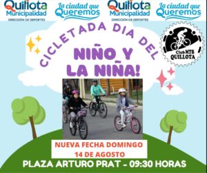 Por su parte, para el domingo 14 de agosto, desde las 09:30 horas, está programada otra actividad organizada dentro de las celebraciones por el Mes de la Niñez, esta vez entre Club MTB Quillota y la Dirección de Deportes de la Municipalidad de Quillota, quienes prepararon varias novedades para los más pequeños durante la nueva Cicletada Familiar Recreativa, cuyo punto de inicio será la Plaza Arturo Prat de Población Corvi, donde se busca seguir potenciando espacios para realizar ejercicio, habiendo muchas sorpresas para niños y niñas que lleguen junto a sus familiares para recorrer la comuna en una caravana multicolor transmitiendo la mejor energía.