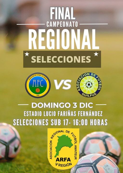 Considerando los positivos antecedentes previos cada vez que se jugaron esta clase de encuentros en la ciudad de Quillota, la Asociación Regional Fútbol Amateur de Valparaíso programó para este domingo 03 de diciembre la gran definición de la categoría varones sub 17 entre las selecciones de Con Con y Quilpué, quienes buscarán el título de la categoría y clasificación para el Campeonato Nacional 2024, cotejo que se iniciará a las 16 horas y promete un alto nivel técnico en el campo, con ambas escuadras dando su máximo esfuerzo para dar alegría a las barras, que prometen llegar en gran número hasta nuestra comuna para alentar a sus respectivos planteles.