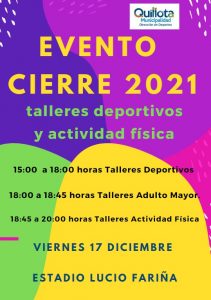 Como una forma de brindar la posibilidad que los niños y adultos puedan disfrutar en tranquilidad las fiestas de fin de año, tanto navidad como año nuevo, la Municipalidad de Quillota a través de la Dirección de Deportes ha determinado que los talleres gratuitos deportivos y de actividad física concluyan sus entrenamientos el viernes 17 de diciembre, para lo cual se llevará a cabo jornada en Estadio Municipal Lucio Fariña Fernández a partir de las 15 horas, oportunidad en que se pretende realizar una muestra recreativa de las diferentes disciplinas, para terminar la tarde con rutina dirigida especialmente para adultos mayores, cerrando con baile entretenido.