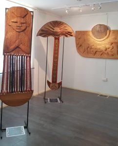 Obras escultóricas en maderas nobles y tejidos en telar witral, son parte de la exposición “Nguillatün” que se está presentando en el Centro de Promoción de la Salud y Cultura, dependiente del Departamento de Salud Municipal de Quillota.