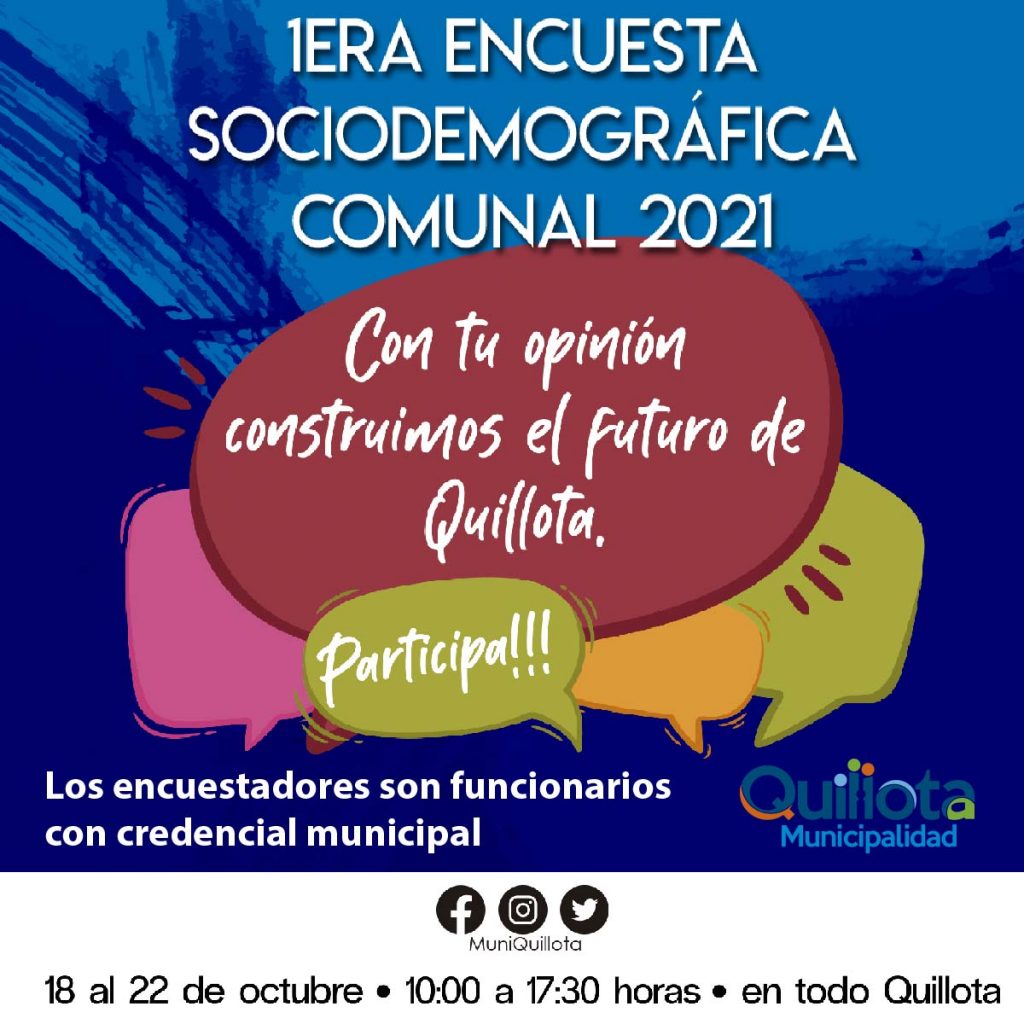 Entre el 18 y 22 de octubre, la Municipalidad de Quillota a través de la Dirección de Desarrollo Comunitario (Dideco) aplicará la Primera Encuesta Sociodemográfica Comunal 2021. Los invitamos a colaborar en esta gran tarea que irá en beneficio de los habitantes de la comuna. En la siguiente nota se aclaran todas las dudas que puedan tener los vecinos y vecinas, con el fin de que participen en este proceso informadamente.