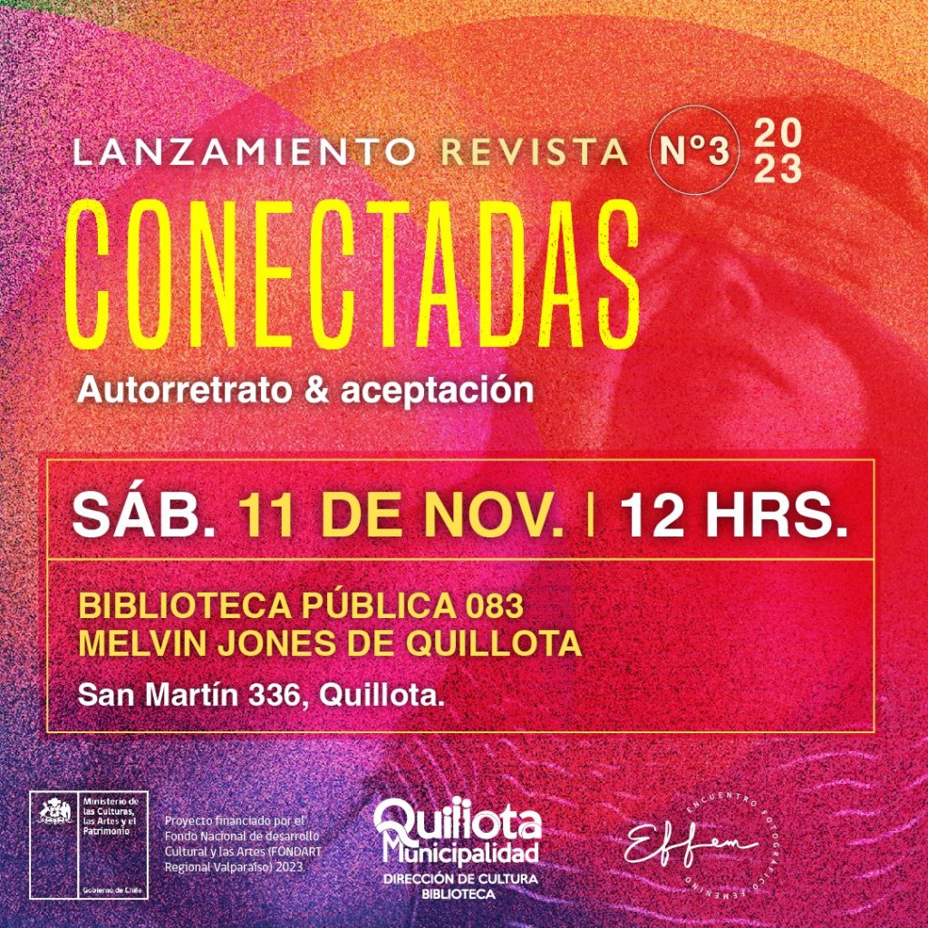 El sábado 11 de noviembre dentro de la Biblioteca Municipal Melvin Jones de Quillota se presentará la última revista de “Conectadas” de Effem (Encuentro Fotográfico Femenino), proyecto que ya cuenta con tres ediciones anteriores, las cuales tienen como ejes temáticos de publicación las mujeres y la experimentación.