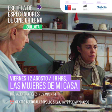 En marco de la Escuela de Espectadores de Cine Chileno, el Centro Cultural Quilpué Audiovisual presentará este viernes 12 de agosto en el Teatro Rodolfo Bravo del Centro Cultural Leopoldo Silva Reynoard, la película “Las mujeres de mi casa” dirigida por Valentina Reyes. El film es protagonizado por Grimanesa Jiménez, Trinidad González y Bernardita Nassar.