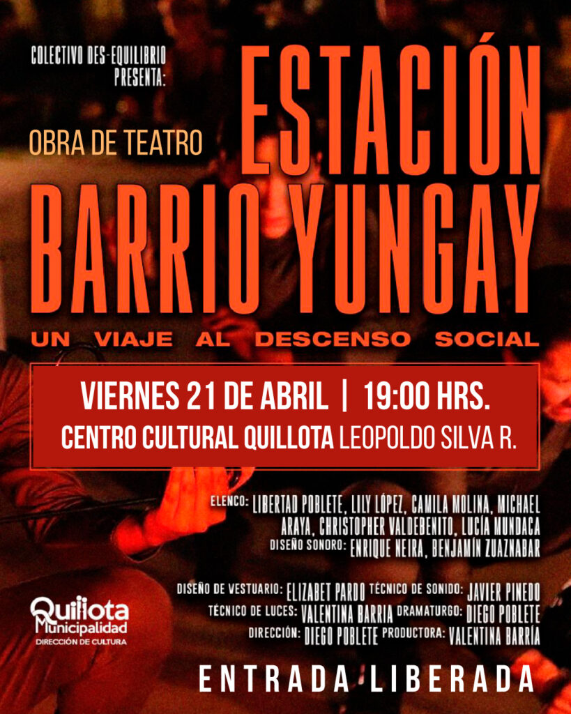Este viernes 21 de abril a las 19:00 horas se llevará a cabo en el Teatro Rodolfo Bravo del Centro Cultural Leopoldo Silva Reynoard la obra “Estación Barrio Yungay”, la que es producida por la compañía “Colectivo Des-Equilibrio”. La trama plantea un universo ficticio inspirado en el metro del nuevo Santiago donde “Todo es gay y gratis”.