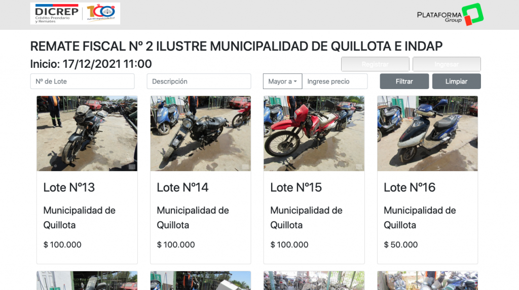 De igual forma, los artículos se pueden observar de manera virtual ingresando al siguiente link: https://remateonline.dicrep.cl/vitrina/index/1594, misma página por donde se efectuará el remate. A través de la sección «Registrar» las personas tienen que inscribirse con Clave Única, con el fin de participar en la subasta que se realizará el próximo 17 de diciembre a partir de las 11 horas.
