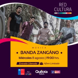 Para este miércoles 11 de agosto a partir de las 19:00 horas, se realizará la presentación de la banda hijuelense “Zangáno”, la cual es parte del proyecto de “Reactivación Cultural” de “Red Cultura”, una iniciativa financiada por el Ministerio de las Culturas, las Artes y el Patrimonio.
