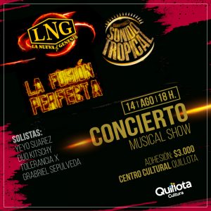 Se trata de un espectáculo de música tropical que tiene un costo de entrada de $3.000.- pesos y reunirá a La Nueva Génesis, Sonido Tropical, La Fusión Perfecta, Yeyo Suárez, Dúo Kitschy, Tolerancia X y Gabriel Sepúlveda.