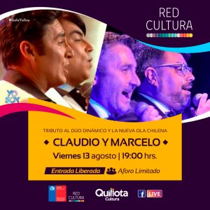 Siguiendo con las actividades en el Teatro “Rodolfo Bravo”, este mismo día a partir de las 19:00 horas, se realizará la presentación del dúo de Claudio y Marcelo, quienes traerán toda la música de la nueva ola e incluso un tributo al “Dúo Dinámico”.