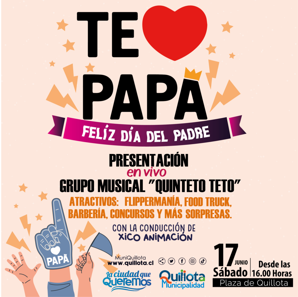 Luego de la pandemia, regresa la celebración comunal del Día del Padre en la Plaza este sábado 17 de junio, desde las 16 horas se realizarán diversas actividades y contará con la presentación del grupo musical «Quinteto Teto». La iniciativa es organizada por la Municipalidad de Quillota, a través de la Oficina de Eventos y Protocolos.
