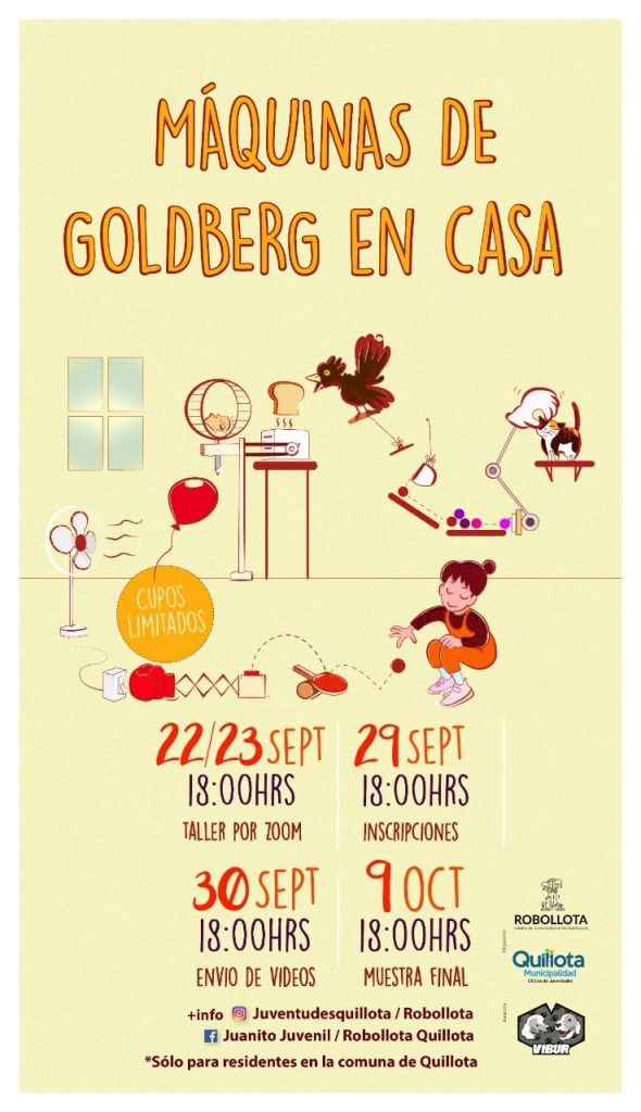 Aprovechando el confinamiento en casa que involucra la cuarentena por la pandemia de Covid-19, la Oficina de las Juventudes, dependiente de la Dirección de Desarrollo Comunitario (Dideco), de la Municipalidad de Quillota y el Club de Robótica Robollota están invitando a participar en un taller y posterior concurso de “Máquinas de Goldberg”, por equipos.