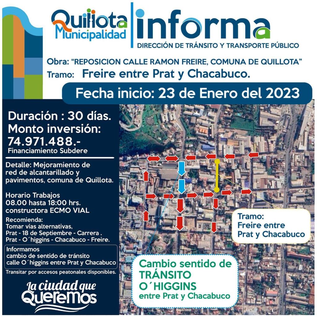 Según explicó el director (S) de Tránsito de la Municipalidad de Quillota, David Leyton Orellana, “para poder dar una vía alternativa a los vehículos que doblaban por Freire, que va a estar cortado, se va a generar un cambio de sentido de la calle O’Higgins, entre Prat y Chacabuco. Esto significa que el Paseo Entre Plazas se mantiene semipeatonal, para el acceso vehicular y peatonal por calzada y por acera. Y los vecinos que ingresaban por Chacabuco hacia la calle O’Higgins, hacia la izquierda, ahora ya no lo van a poder hacer. Por ende, van a tener que ingresar por calle Prat y O’Higgins”, hacia el cerro, detalló el profesional.