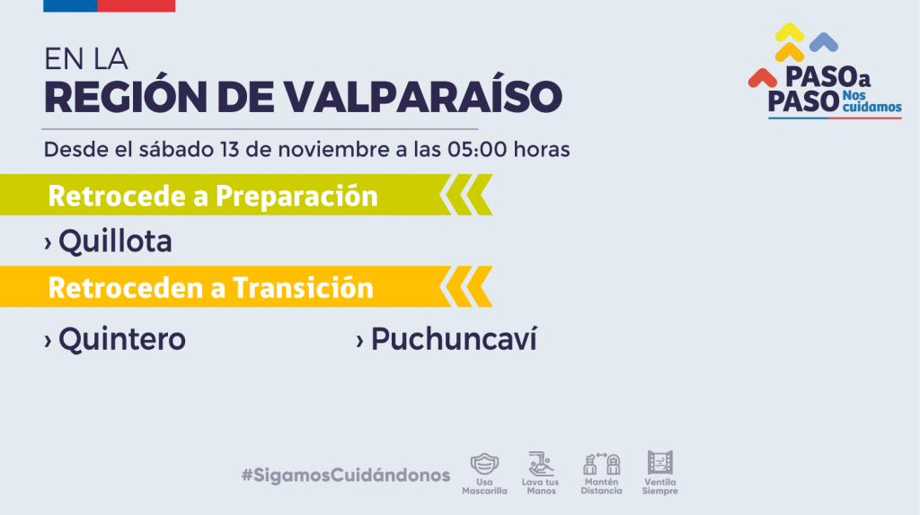 Tras permanecer por más de tres meses en la fase de apertura inicial en el Plan Paso a Paso del Ministerio de Salud, durante el informe de las autoridades el pasado jueves 11 de noviembre se informó que Quillota debía retroceder a la fase de transición desde el sábado 13 de noviembre a las 05 horas, situación que se generó al presentarse un importante aumento de casos activos que se han declarado en los últimos días, por lo cual el llamado de autoridades es a extremar las medidas de autocuidado, y en el caso de las actividades deportivas, respetar nuevos aforos establecidos por las autoridades, para así poder regresar pronto a la apertura inicial.