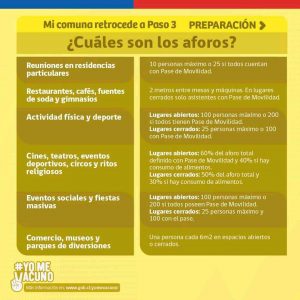 Asimismo, en el caso de la realización de actividad física, cuando se desarrolle en espacios abiertos, la cantidad máxima de personas será de 200 participantes, siempre que todos posean su respectivo pase de movilidad, y en el caso de no tenerlo una o más personas, el aforo se reduce a 100. Por su parte, en un espacio cerrado, sin exigir pase de movilidad, sólo podrán reunirse 25, pero aumenta a 100 en el caso de contar con el documento. Para eventos deportivos en lugares abiertos, se permite el 60% del aforo total con pase de movilidad y 40% si se considera consumo de alimentos. En sitios cerrados, esto sería 50% y 30% del aforo total respectivamente.