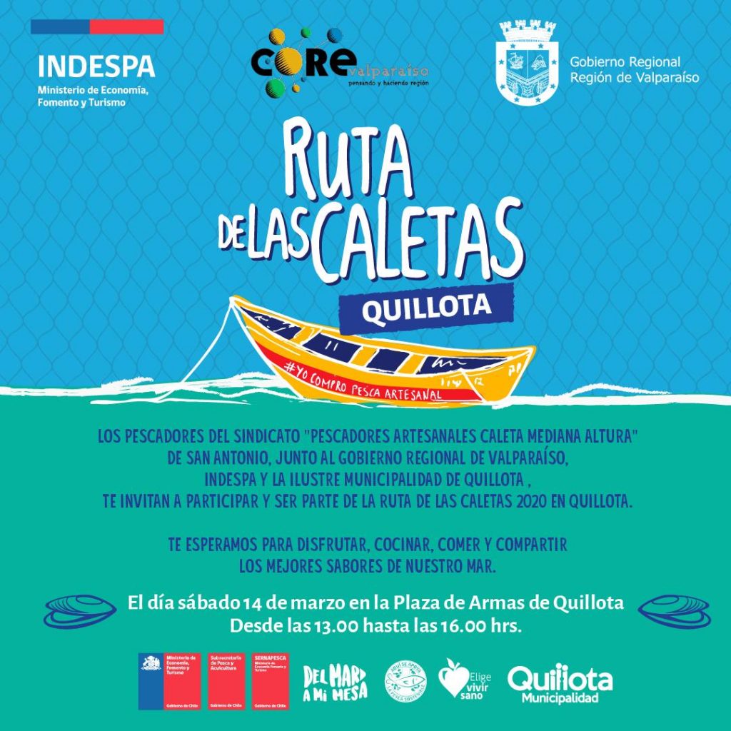 Tras el gran éxito de la Ruta de las Caletas en Curicó, Rancagua, Antofagasta, Iquique, Los Vilos y Chillán la iniciativa llega a Quillota este sábado 14 de marzo a las 13:00 horas en la Plaza de Armas de Quillota, junto a los pescadores y recolectores del sindicato “Pescadores artesanales caleta mediana altura” de San Antonio.