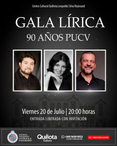 En el marco de la celebración de los 90 años de existencia de la Pontificia Universidad Católica de Valparaíso, dicha casa de estudios ofrecerá en Quillota una Gala Lírica a cargo de la Orquesta de Cámara PUCV –que a su vez lleva 20 años de trayectoria- y de los destacados solistas nacionales Carolina García- Valentín, Leonardo Pohl y Cristián Moya, en la interpretación de una selección de obras de la literatura musical universal.