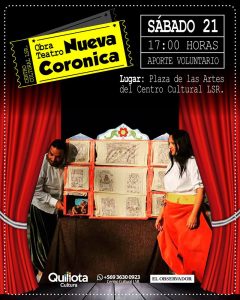 La tarde del sábado se realizará el espectáculo familiar denominado “Nueva Coronica”, una obra de teatro para público general desde los 8 años de edad, propuesta de corte mixto que incluye actuación, narración, marionetas y otros elementos, todo como propuesta de la Compañía de Teatro La Emperatriz.