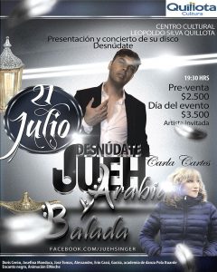 El mismo sábado, pero a las 19:30 horas en el Teatro del recinto, se realizará el lanzamiento y concierto del disco “Desnúdate”, del cantante hijuelense Jared Jueh, monitor de canto y especializado en balada árabe, quien llega en compañía de la artista invitada Carla Cartes.