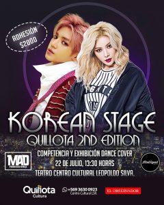 Este domingo 22, desde las 13:30 horas, se realizará un nuevo encuentro con la cultura, la música y el baile coreano, gracias al evento denominado Korean Stage Quillota 2nd Edition, que en esta oportunidad se efectuará en el Teatro “Rodolfo Bravo” del Centro Cultural, una gran oportunidad para disfrutar en un ambiente familiar y la oportunidad de apreciar el trabajo coreográfico de decenas de grupos que se presentan en competición para la evaluación del jurado.