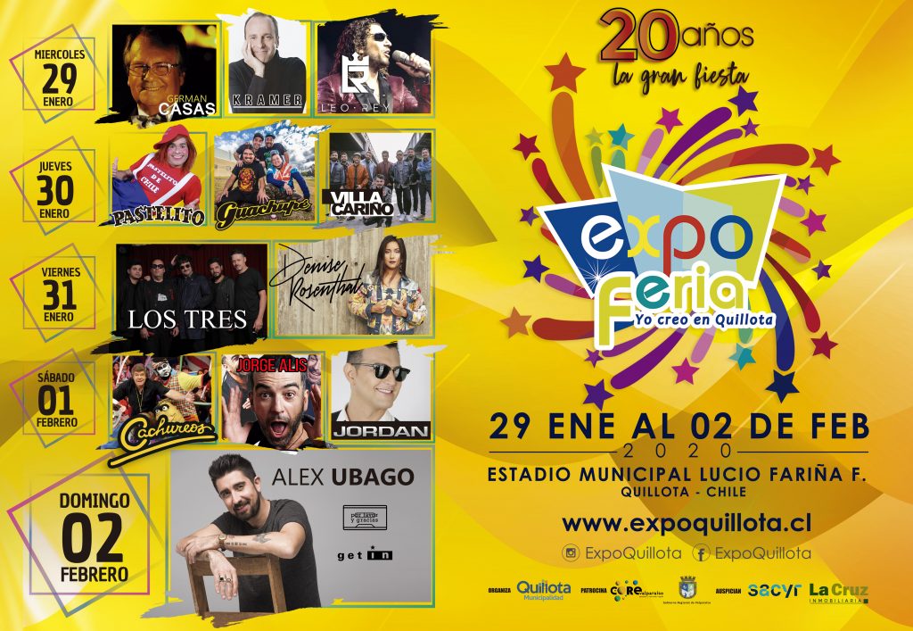 La parrilla mantiene los mismos artistas, solo hubo ligeros cambios de días, es así como Víctor Vargas, productor general de la Expo Quillota, comentó que “estamos muy contentos, porque ya estamos en condiciones de confirmar la parrilla de artistas, ha sido muy difícil congeniar los tiempos y agendas de cada uno de los, agradecerle a la empresa bizarro que nos ha permitido contar prácticamente con la misma parrilla de artistas, salvo unos días que por lógica de programar una agenda de expo qta dos mese despues se generan estos inconvenientes pero tenemos parrilla, así que lo único que nos queda es agradecer a la gente por su paciencia y desde ya extendemos la invitación a toda la gente de la región de valparaíso para tener una gran fiesta del verano con esta expo qta ue también es la gran fiesta de los 20 años.
