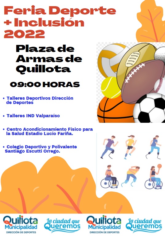 Tras más de dos años con las actividades presenciales de toda índole suspendidas, como medida para disminuir la propagación de casos de Coronavirus en la ciudad de Quillota, poco a poco las autoridades sanitarias de Chile han ido flexibilizando las exigencias, situación que le permitió a la Dirección de Deportes de la Municipalidad ir retomando sus talleres gratuitos a disposición de la comunidad, y en este sentido, para el próximo viernes 01 de abril se programó la primera Feria Deporte + Inclusión, espacio para que las personas puedan conocer más detalles sobre cada una de estas iniciativas, además de lo realizado por otras instituciones en nuestra comuna.