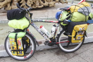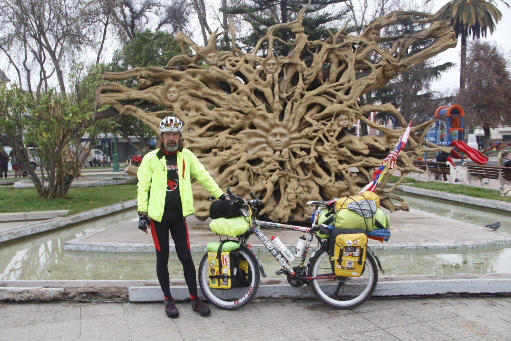 Ahora emprendió el regreso a través Chile y luego de llegar a Santiago, decidió conocer la Región de Valparaíso. Temprano este lunes apareció por la Municipalidad de Quillota, con casco, tenida de ciclista y una decorada bicicleta pistera, donde carga un equipaje liviano y álbumes, con fotografías y recortes de prensa de sus diferentes escalas a lo largo del continente.